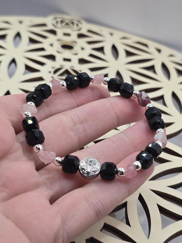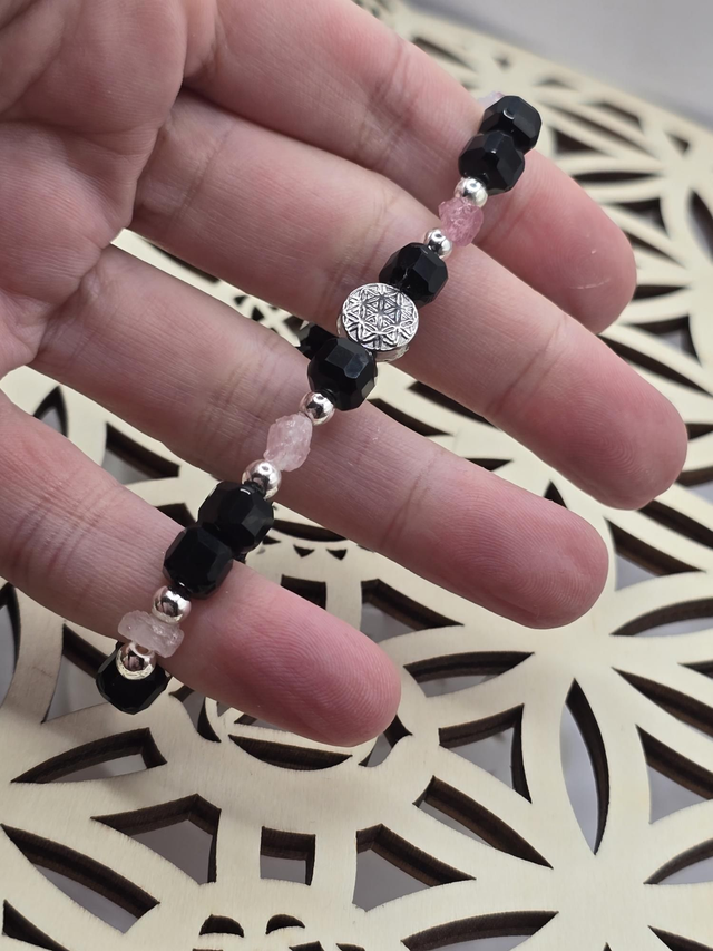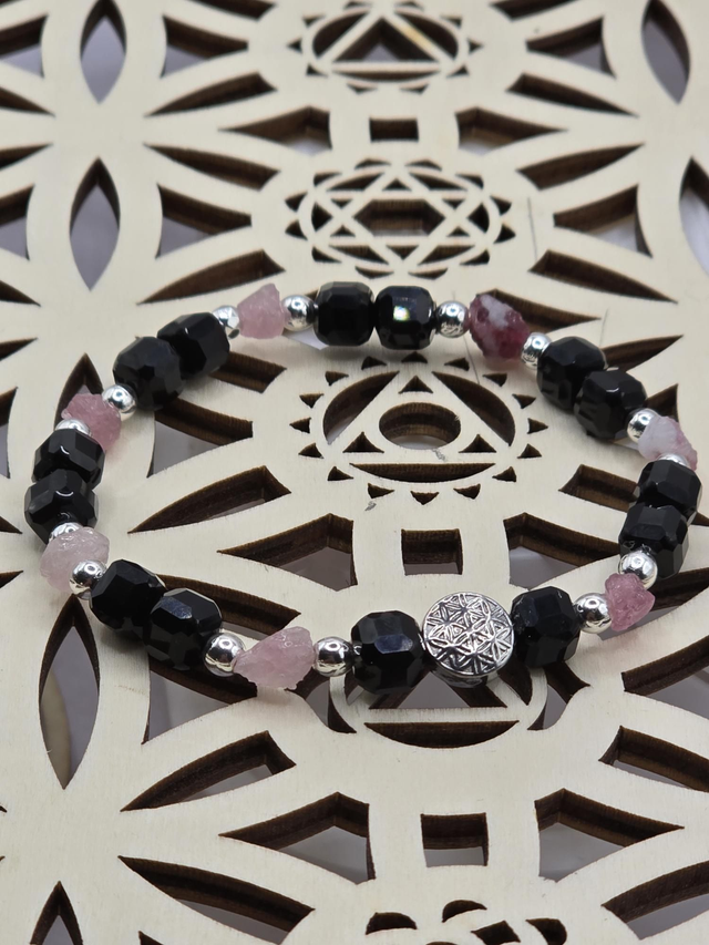 Bracelet fait main sur fil élastique solide composé d'Onyx carré & Tourmaline rose brute ainsi que de perles de perles en hématite plaquée et acier inoxydable.