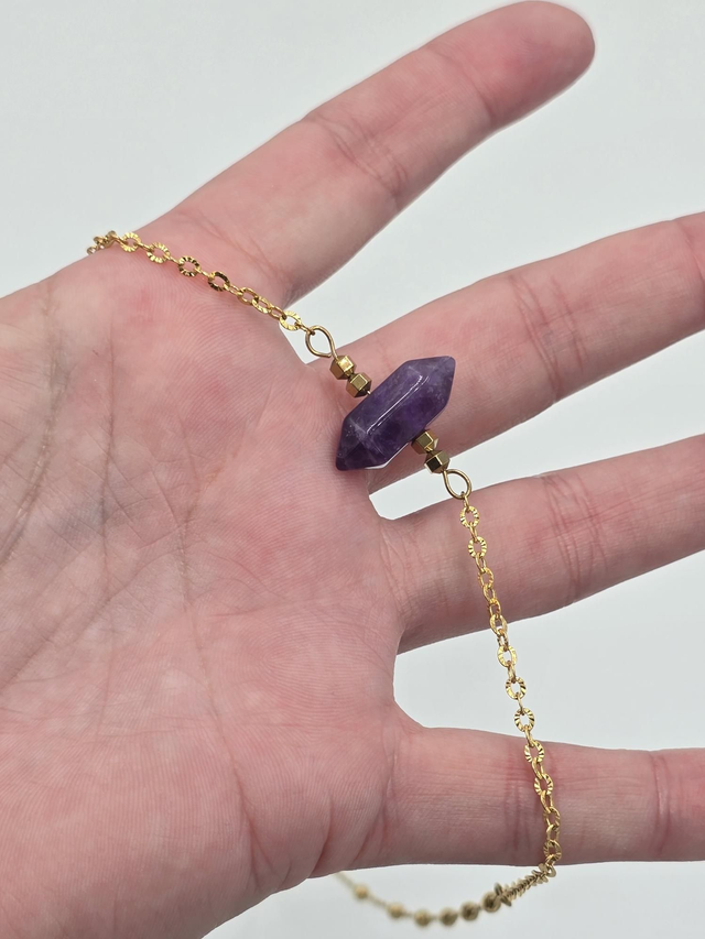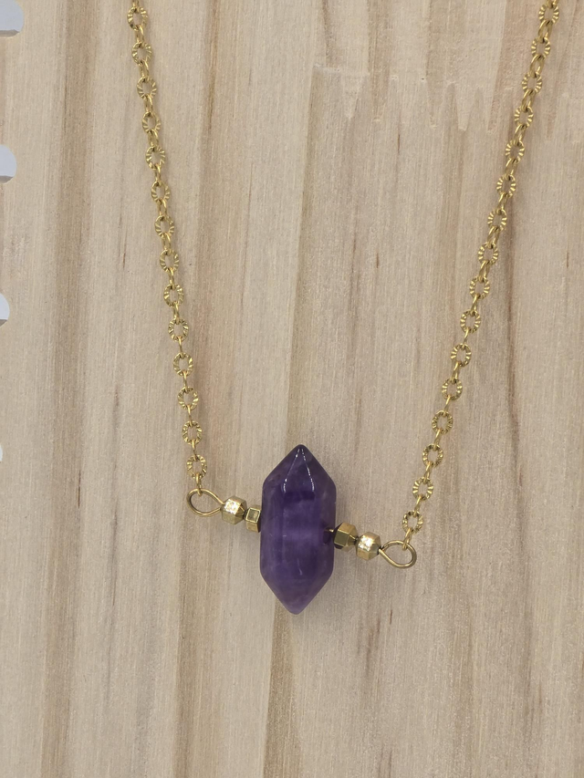Collier fait main avec chaîne en acier inoxydable doré et pierre naturelle d'Améthyste.