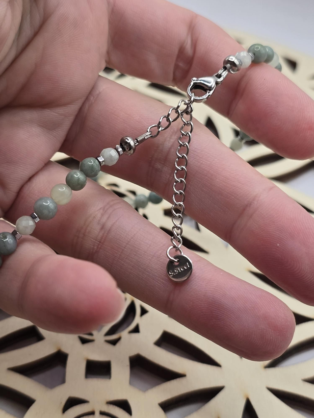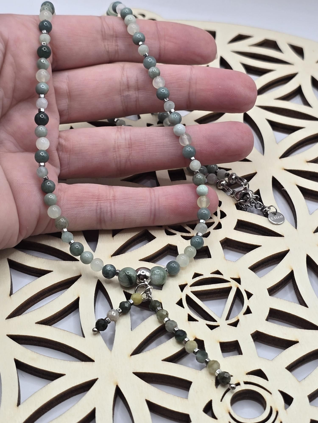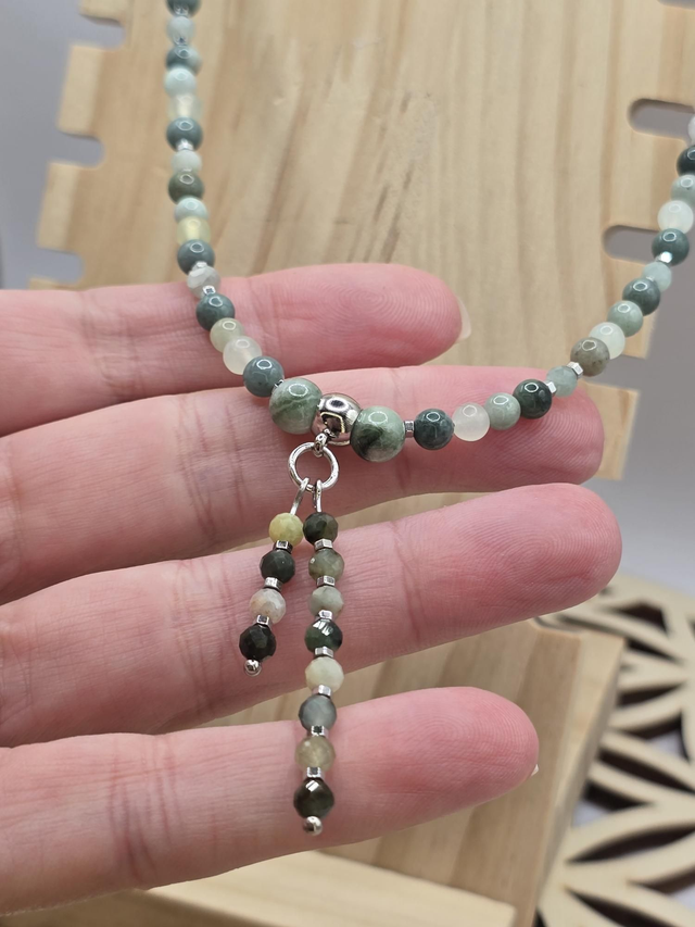 Collier fait main en perles de Jade vert en 0,4 cm : Jade de Chine, Jade de Birmanie, Jade du Guatemala ainsi que de perles en hématite plaquée, et pendentif en acier inoxydable.