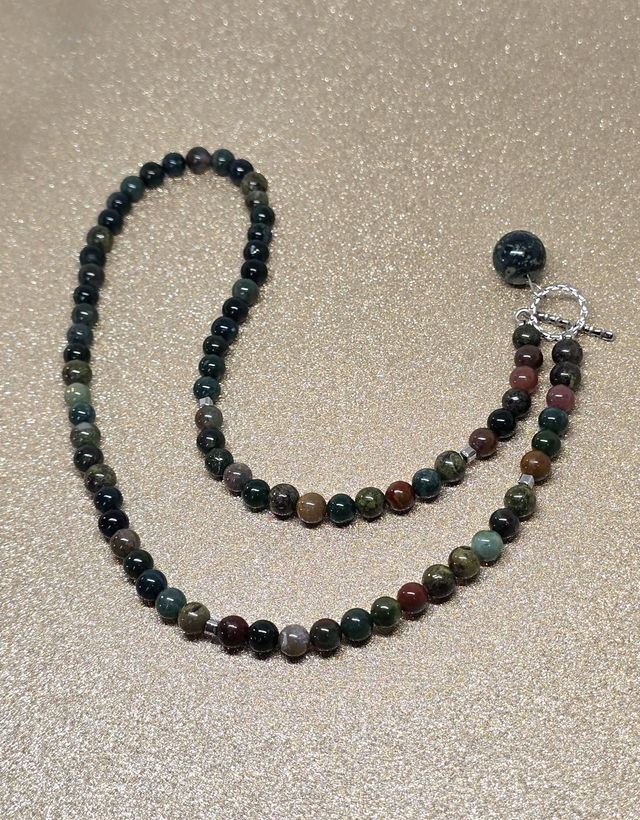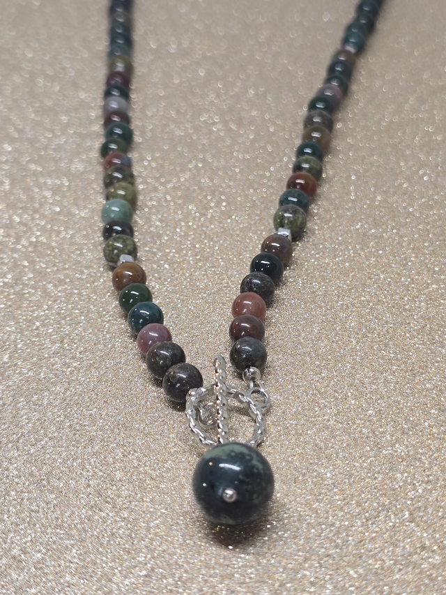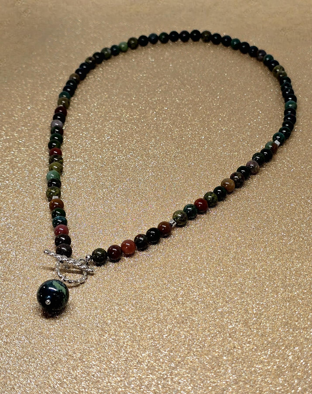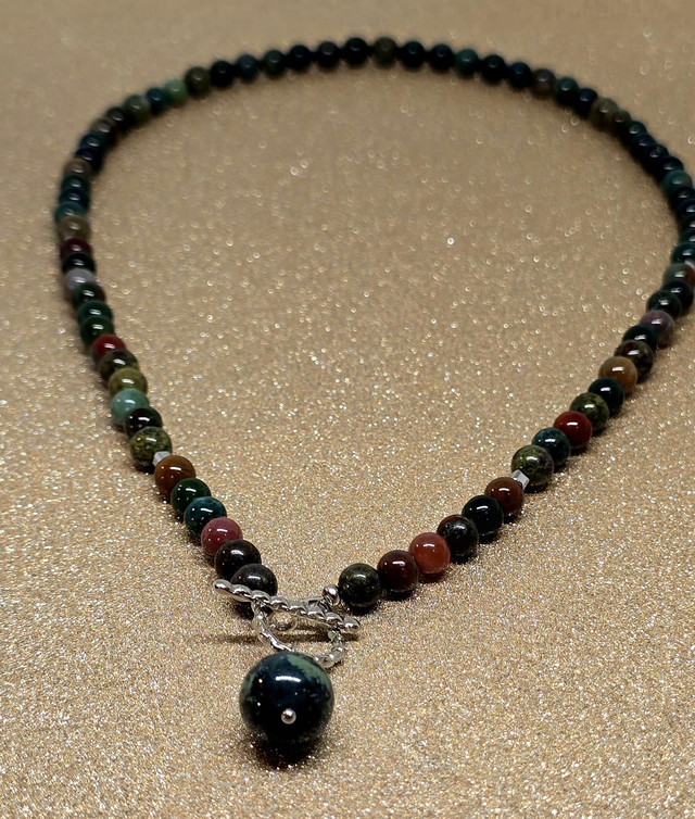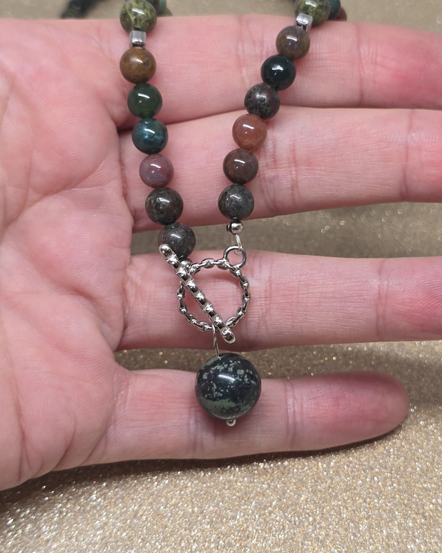 ✨ Collier d'environ 48 cm en Jaspe Héliotrope de 0,6 cm ainsi qu'un pendentif en Jaspe Kambaba d'1,2 cm. Fermoir en T en acier inoxydable