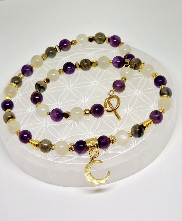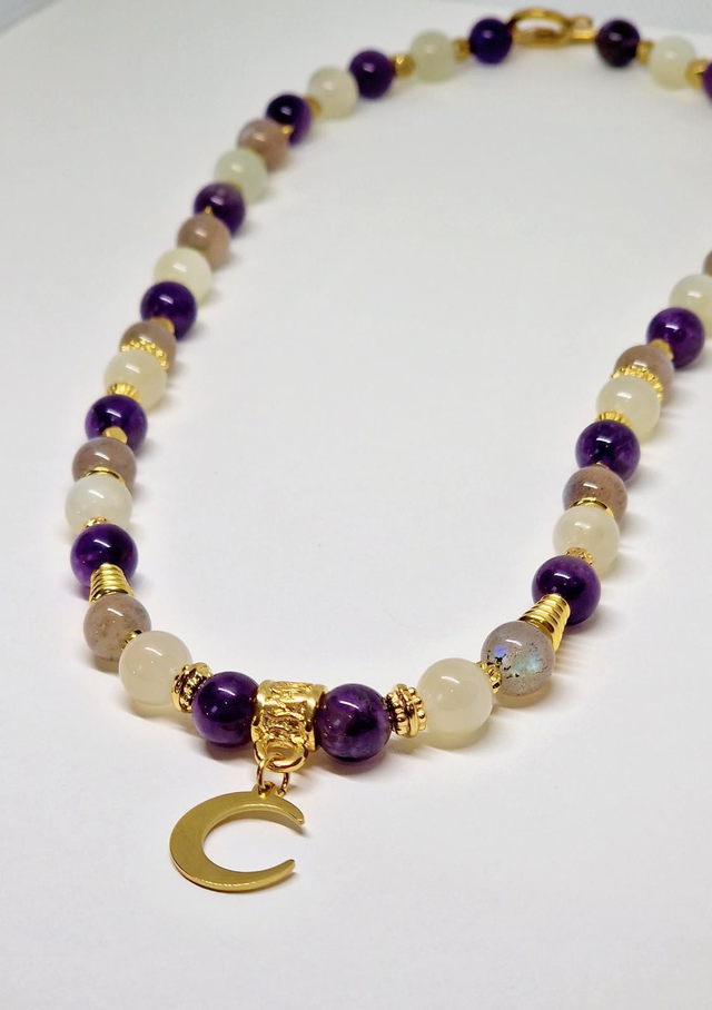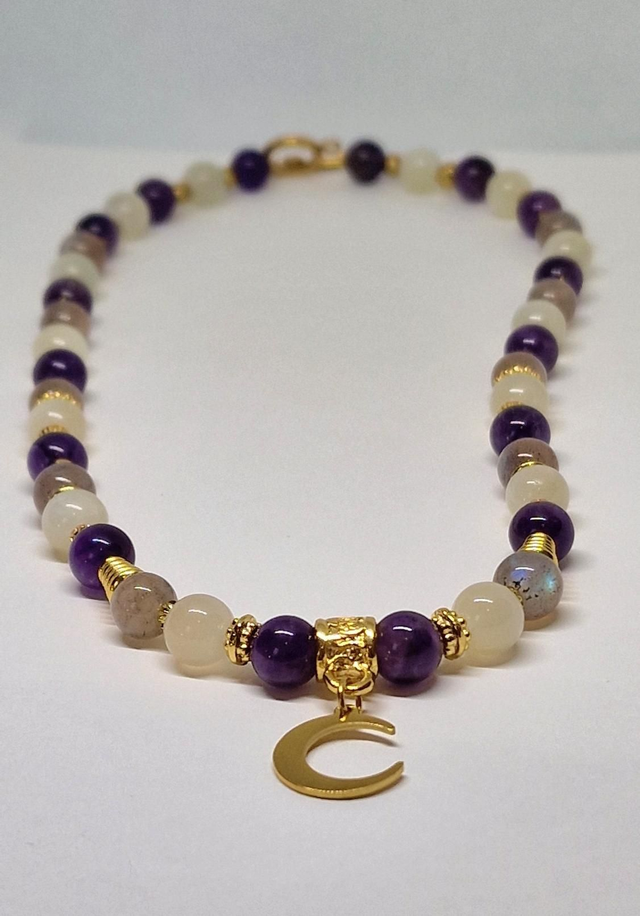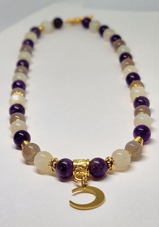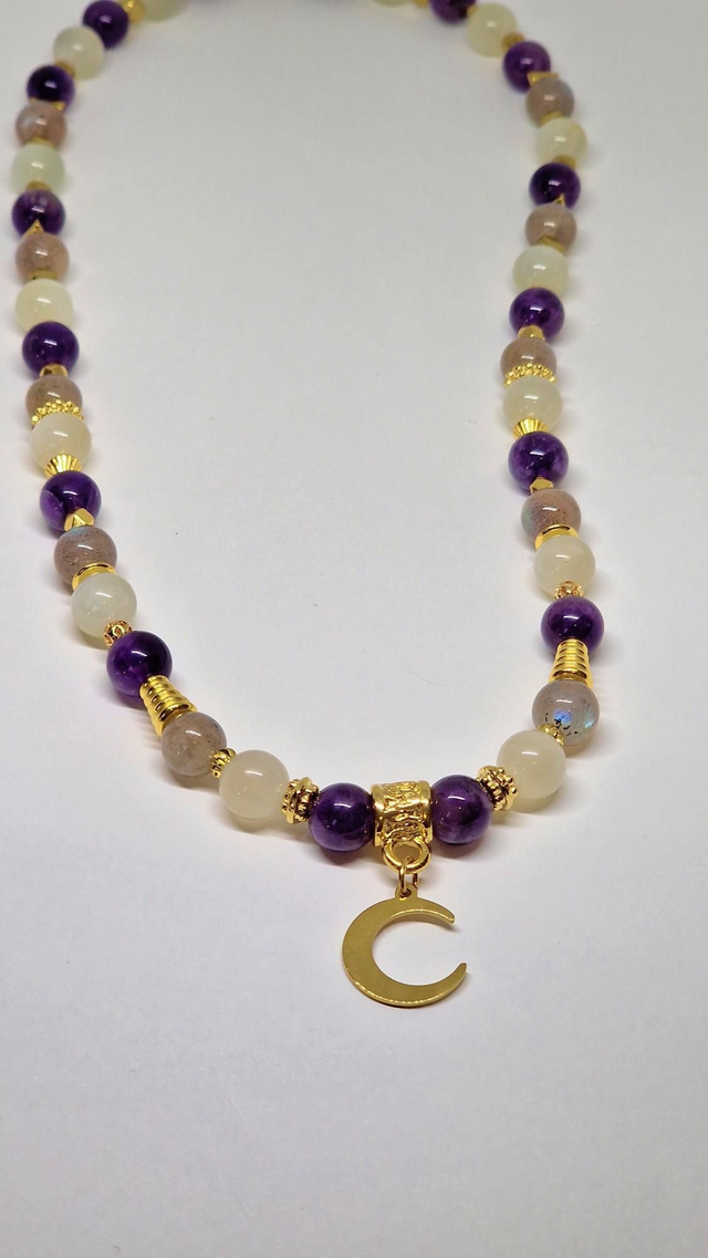 Collier fait main sur fil cristal solide de 0,5mm, composé de Pierre de lune, Améthyste, Labradorite en 0,8 cm ainsi que de perles, fermoir et pendentif en acier inoxydable et dorées à l'or fin Dimensions : 48 cm