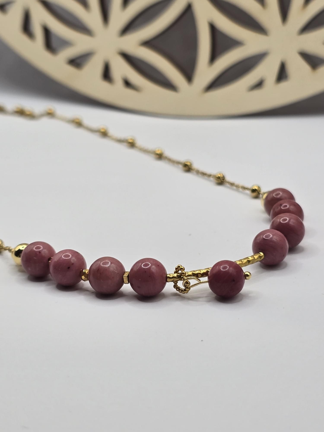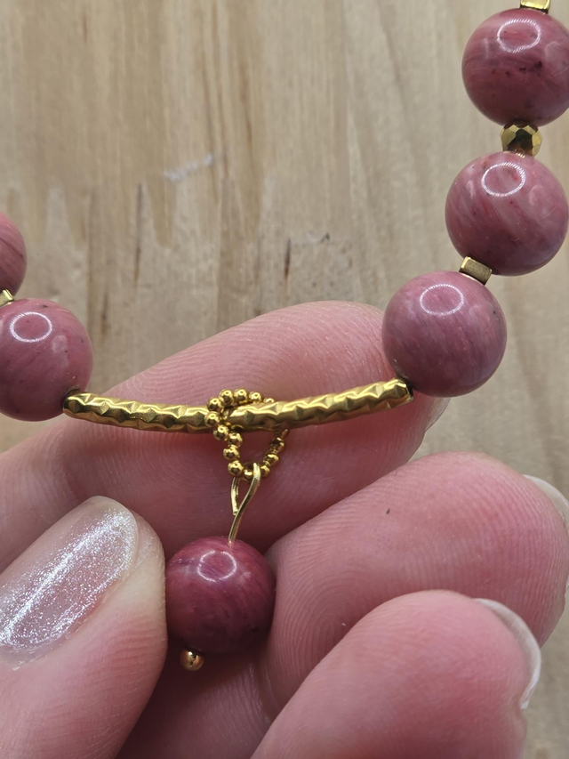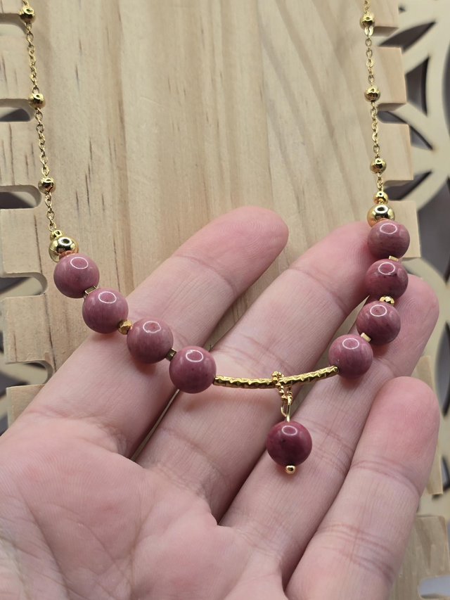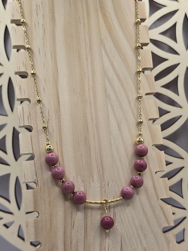 Collier fait main composé de Rhodonite rose en 0,8 cm ainsi que de perles, chaîne et fermoir crochet en acier inoxydable.