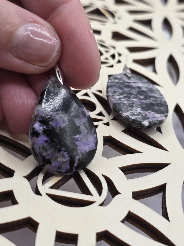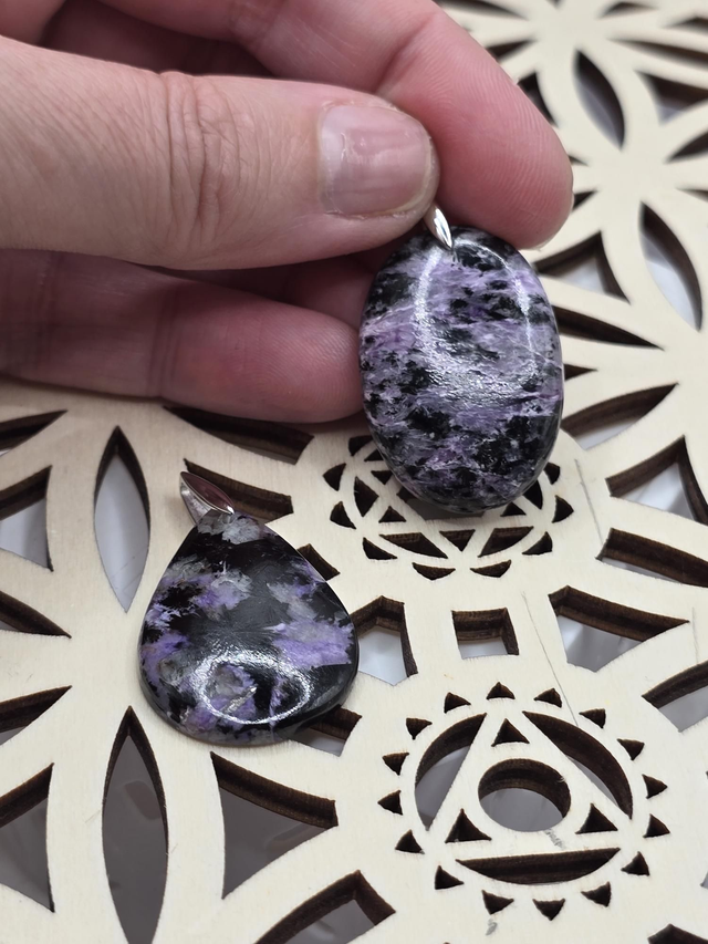 Charoïte : Chakra coronal (violet) : aide le corps à retrouver son équilibre, stimule le système immunitaire (foie et pancréas), recharge en énergie le corps épuisé, aide à calmer les troubles autistiques et bipolaires, calme les tendances à avoir peur, guérison émotionnelle par l'acceptation du présent, aide à s'aimer, diminue l'impulsivité, aide à percevoir ce qui juste.