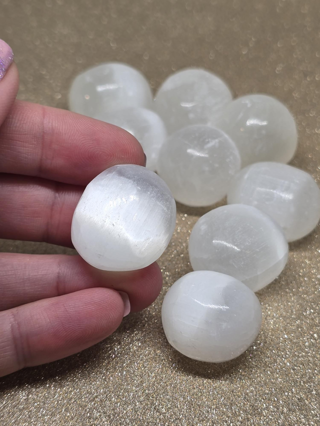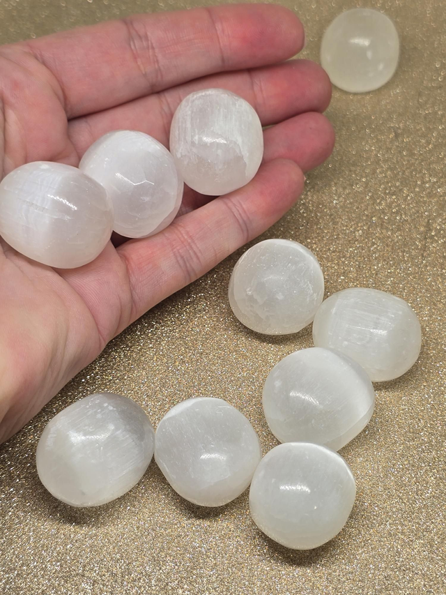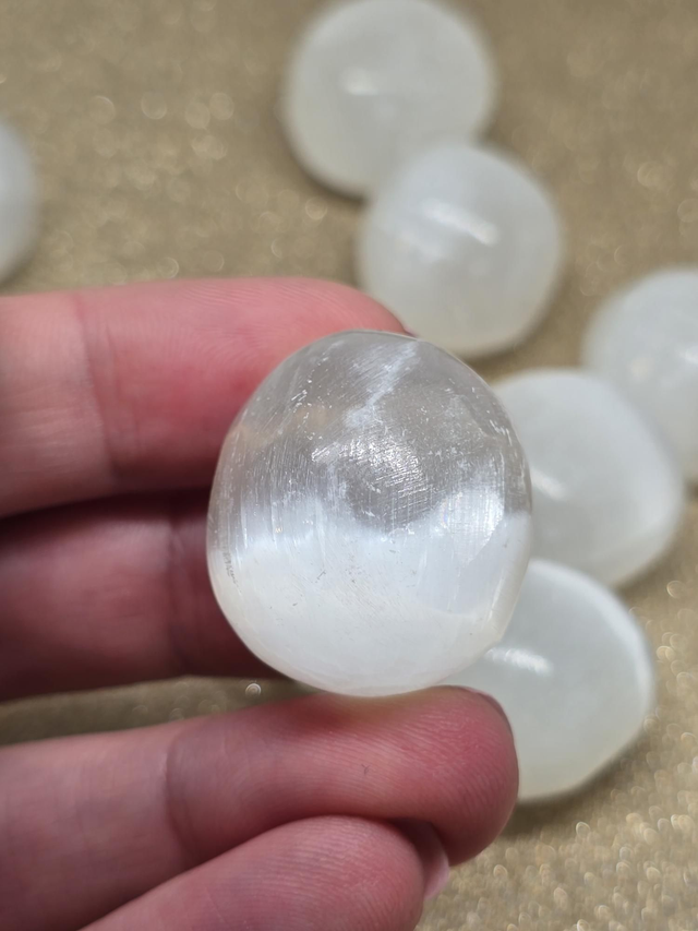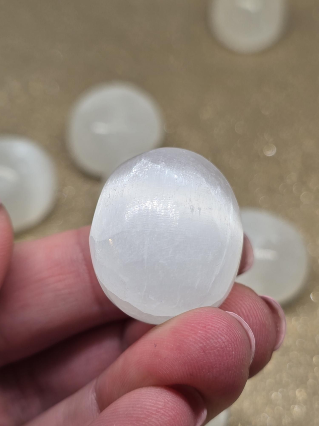 Sélénite : Chakra coronal : apporte douceur, apaisement, relaxation, calme. Pierre qui démultiplie les propriétés des autres pierres. Apporte sommeil apaisant, apaise le système nerveux, sentiment de bien-être physique, soutient les organes du ventre.
