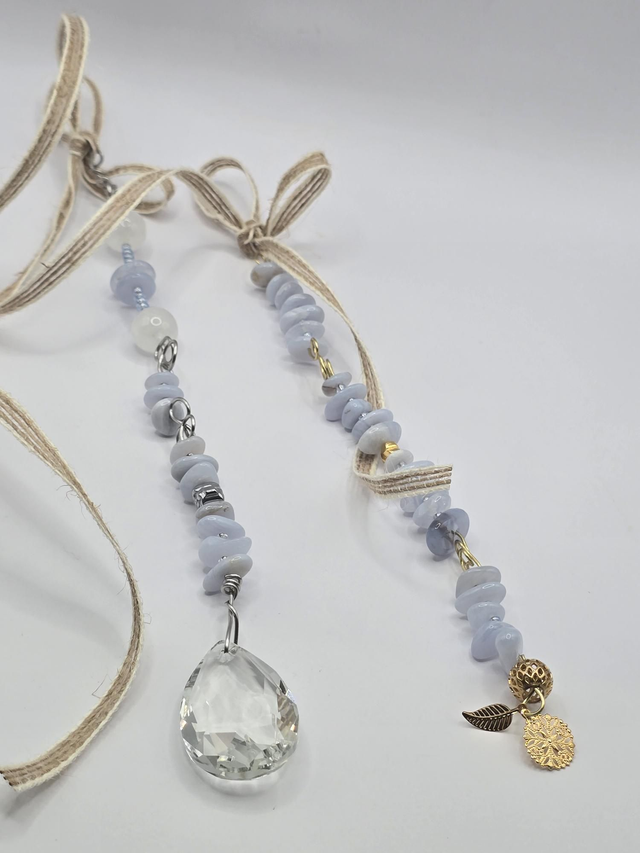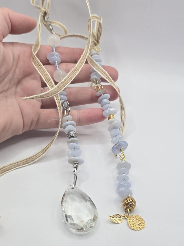 Suspension pour rétroviseur fait main sur fil acier flexible et pierres naturelles (à manipuler avec précaution). Pour l'attacher, nouer le ruban en jute autour du rétroviseur.