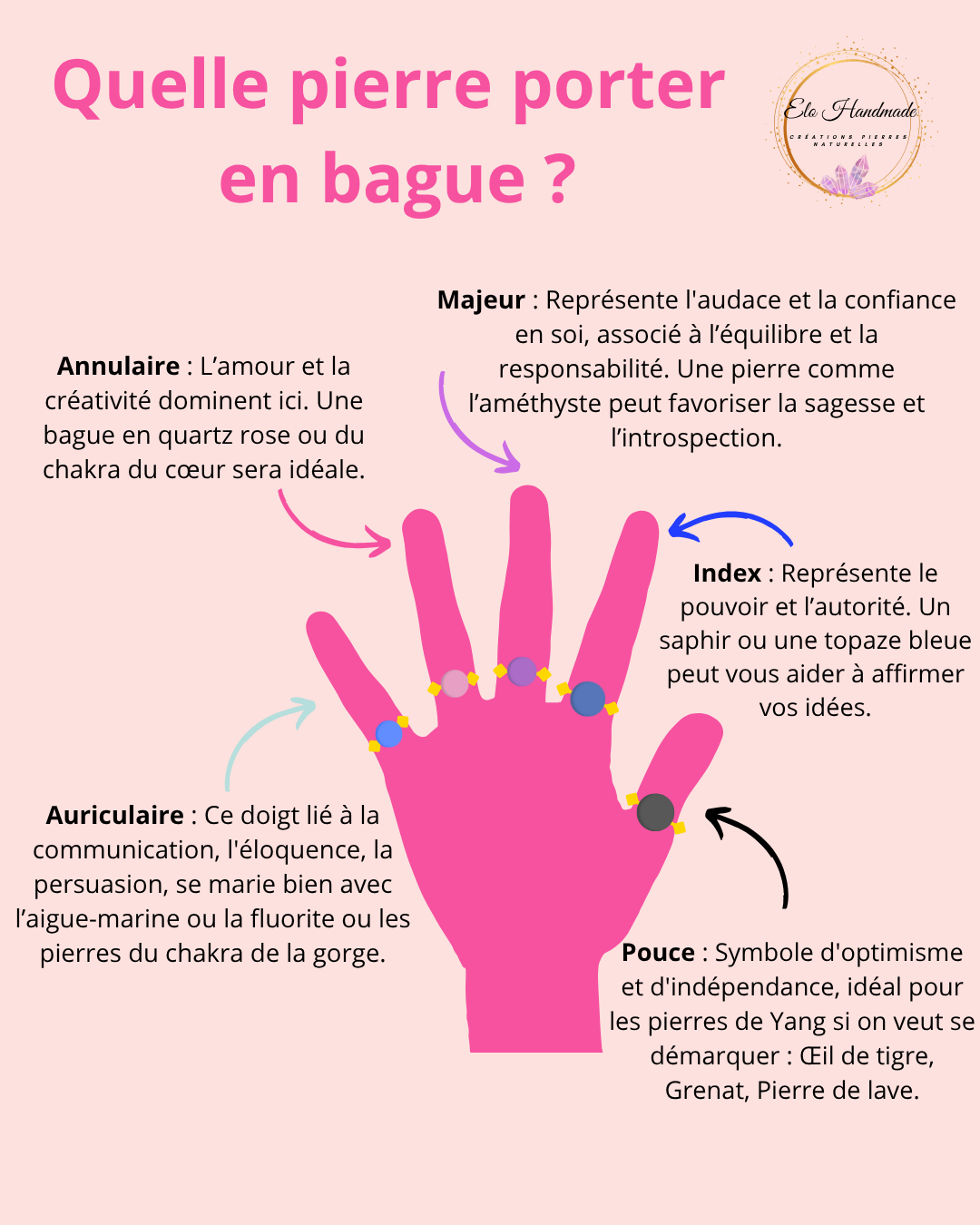 - Auriculaire : Ce doigt lié à la communication, l'éloquence, la persuasion, se marie bien avec l’aigue-marine ou la fluorite ou les pierres du chakra de la gorge.