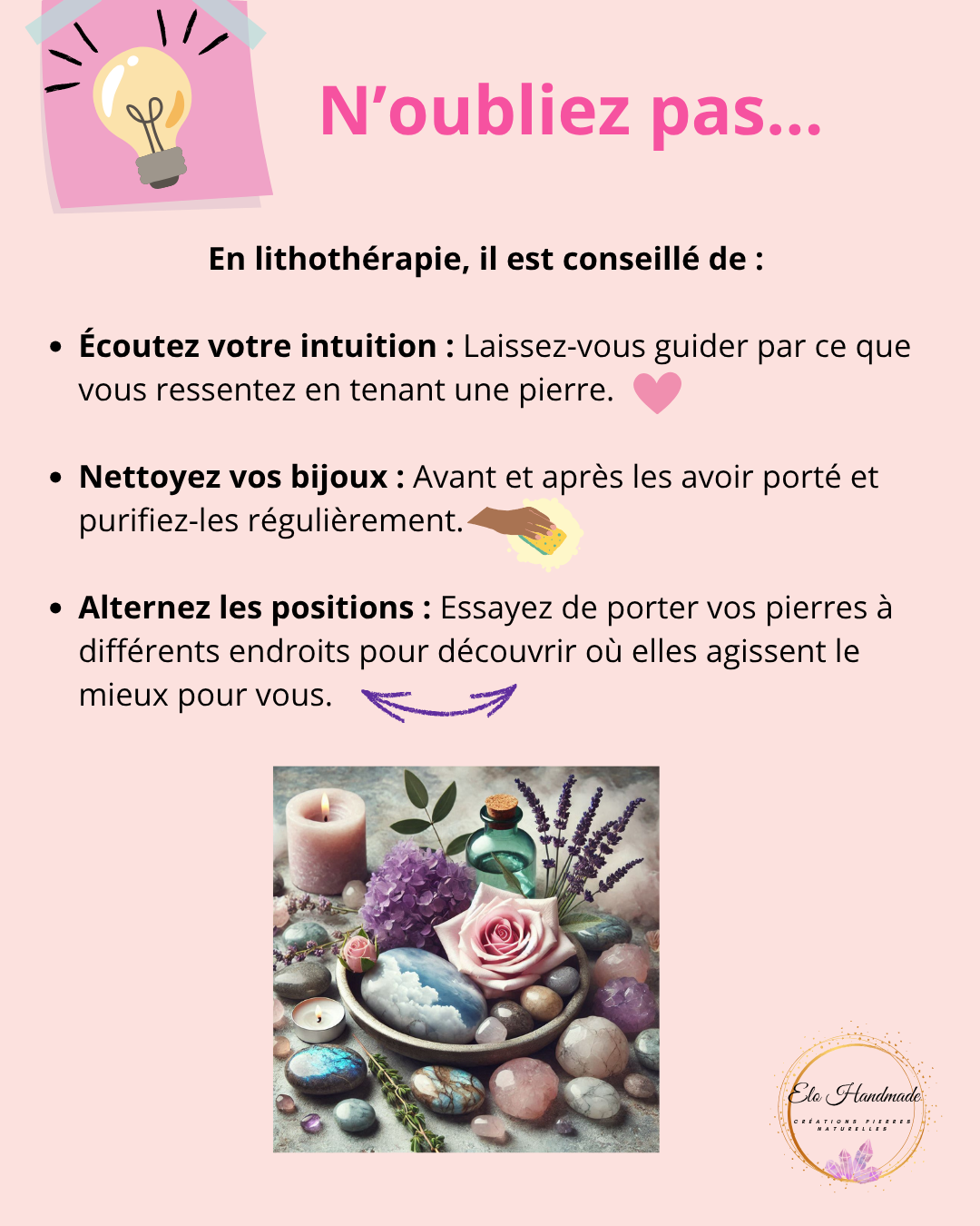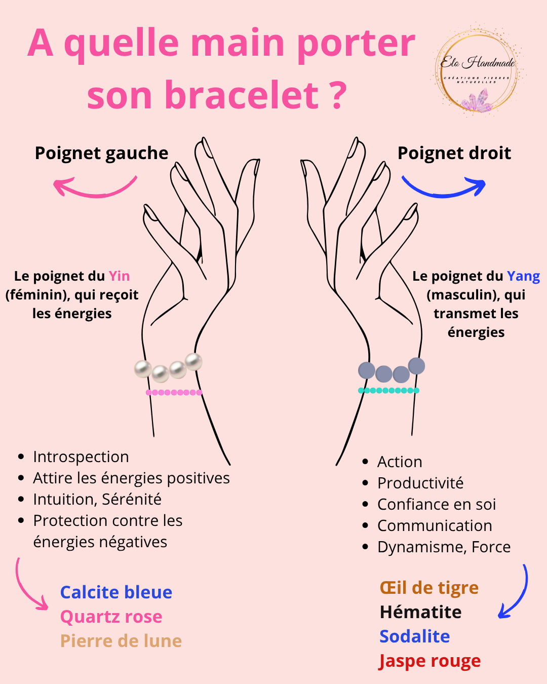 - Exemple : la calcite bleue, le quartz rose et la pierre de lune sont idéales pour ce poignet.