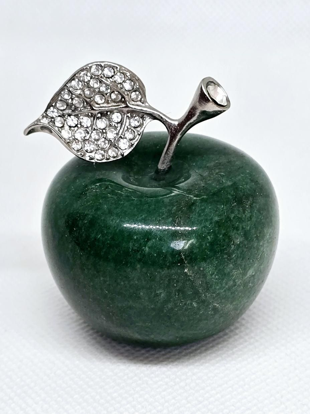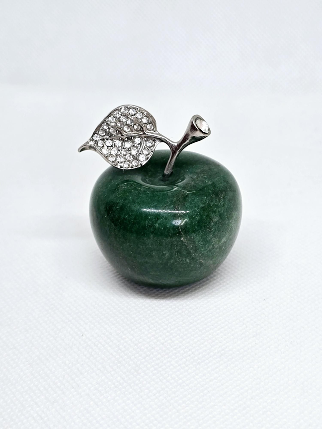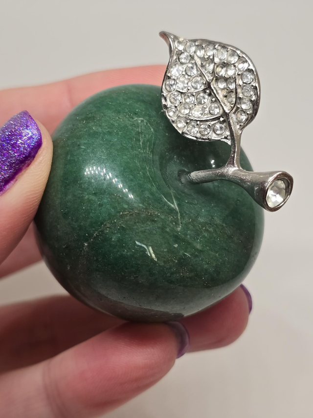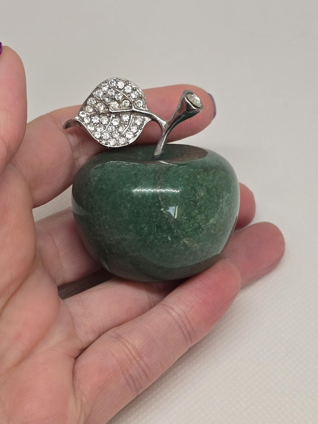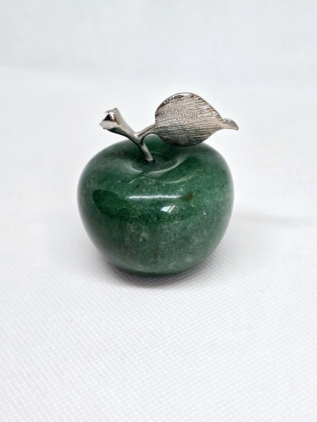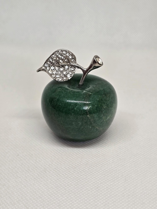 Pomme en Aventurine verte d'environ 4,5 cm de hauteur et 5,5 cm de largeur.