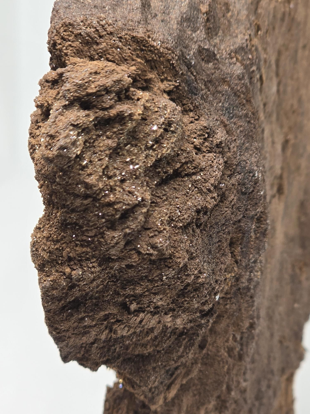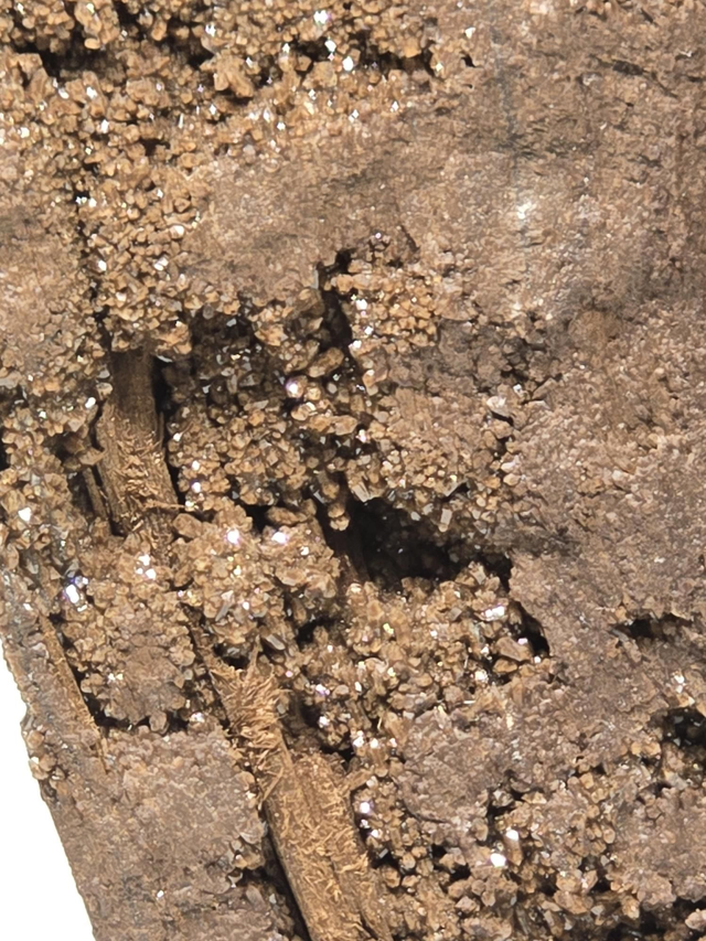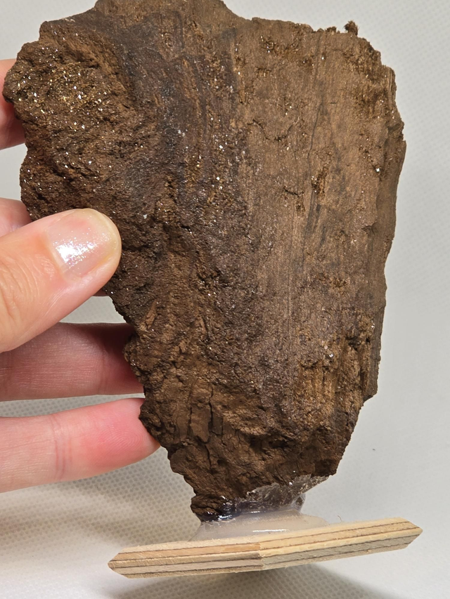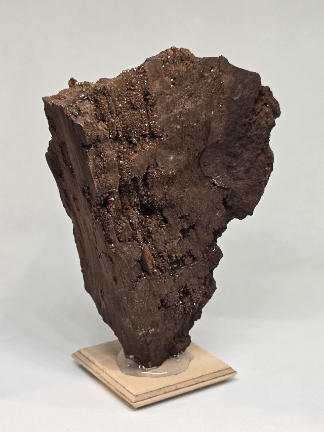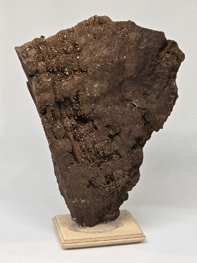 Pièce exceptionnelle de bois fossilisé avec cristallisation. Sur socle bois.