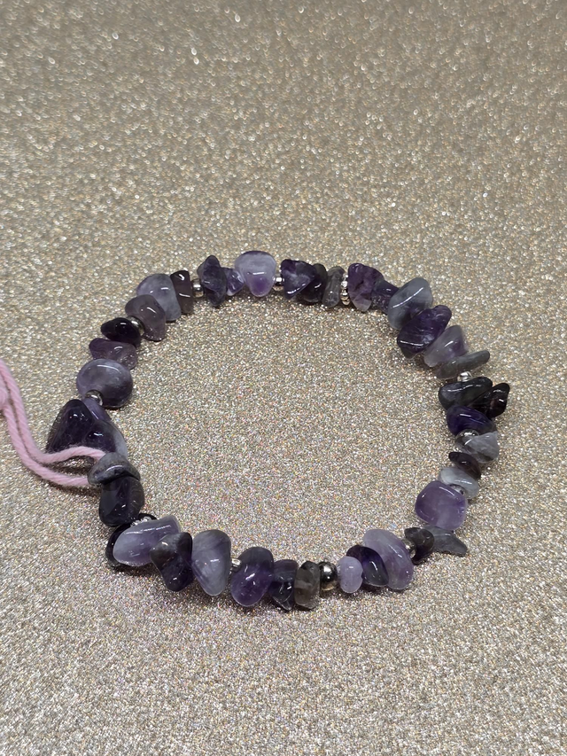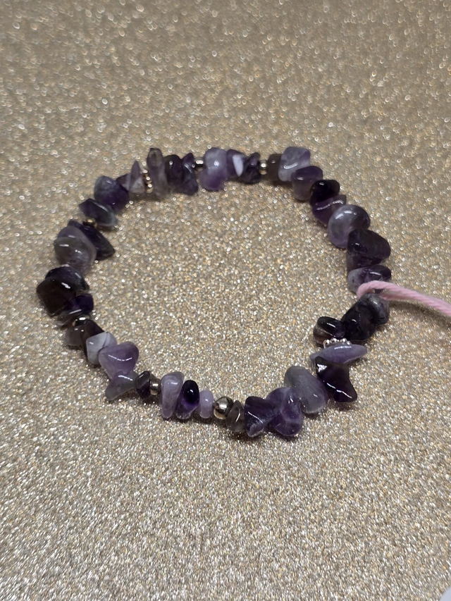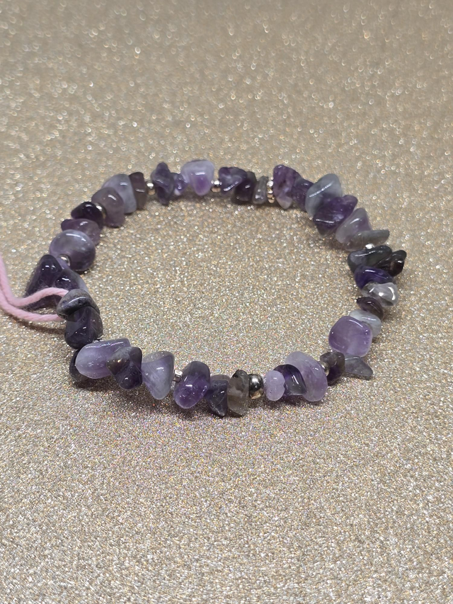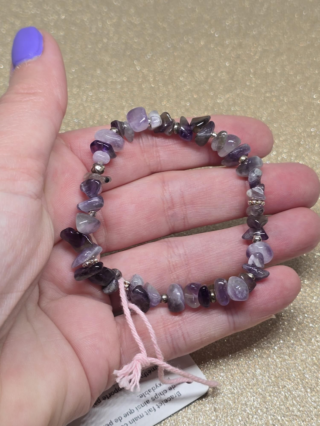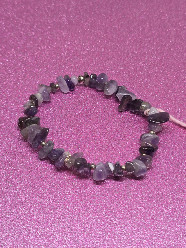 🌟 Bracelet baroque fait main sur fil élastique solide et composé d'Améthyste forme chips ainsi que de perles dorées à l'or fin