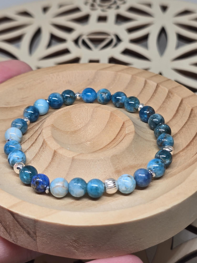 Bracelet fait main sur fil élastique solide composé d'Apatite bleue en 0,6 cm ainsi que de perles en hématite plaquée et acier inoxydable.