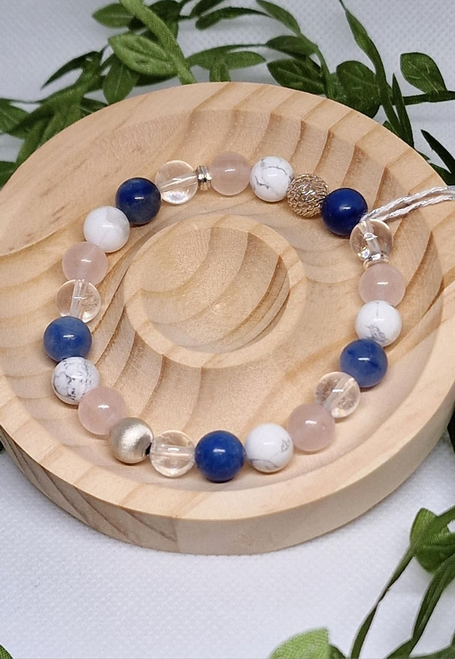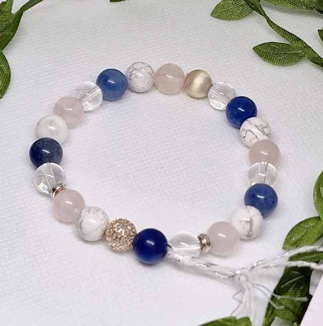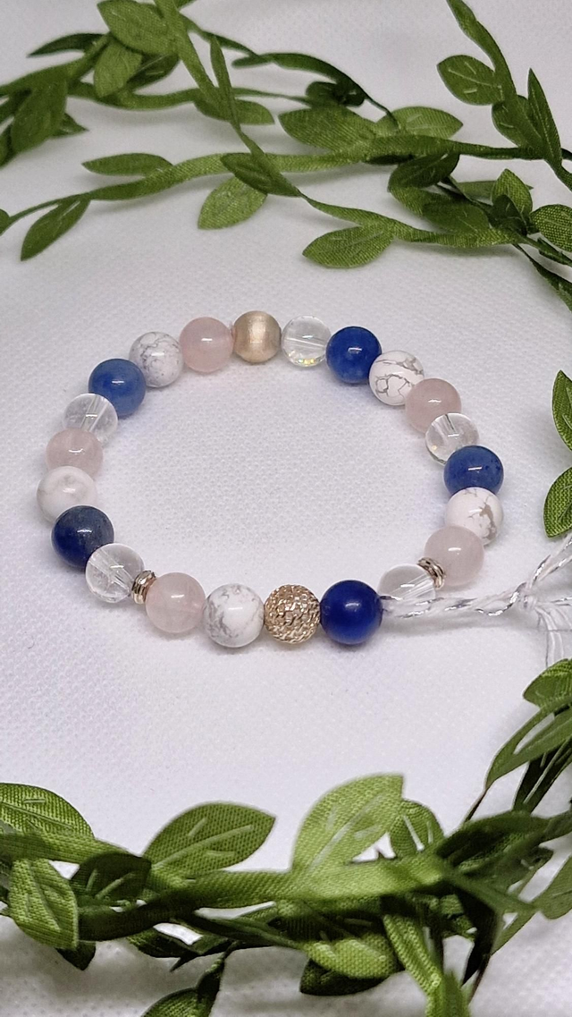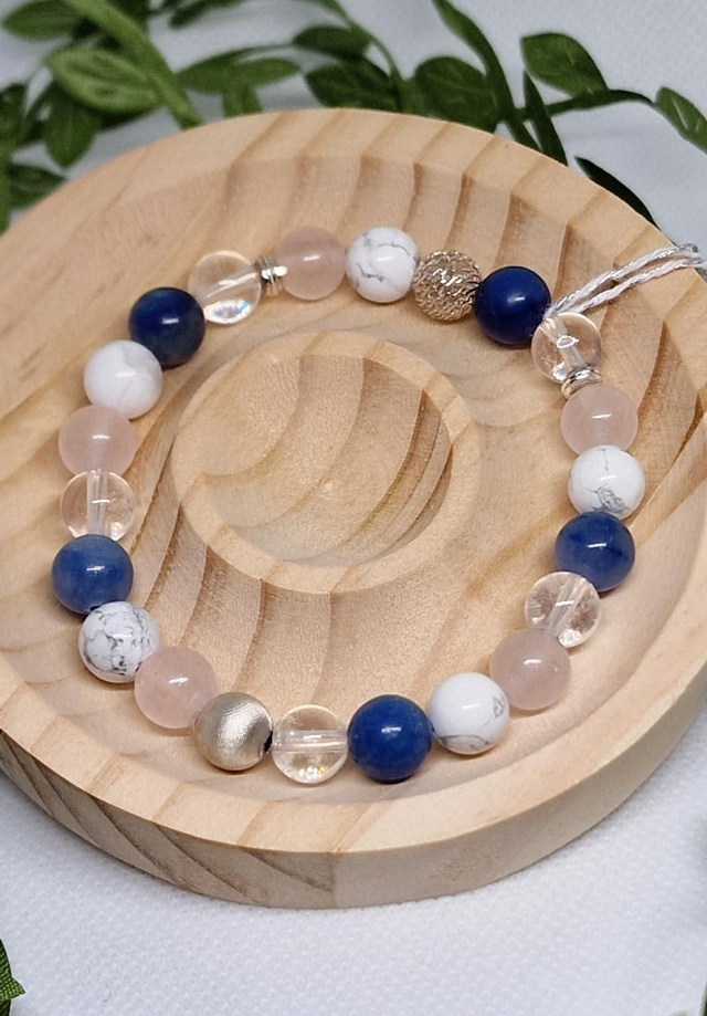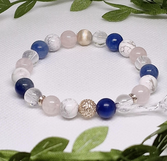 Bracelet Aventurine bleue, Quartz rose, Howlite, Cristal de roche