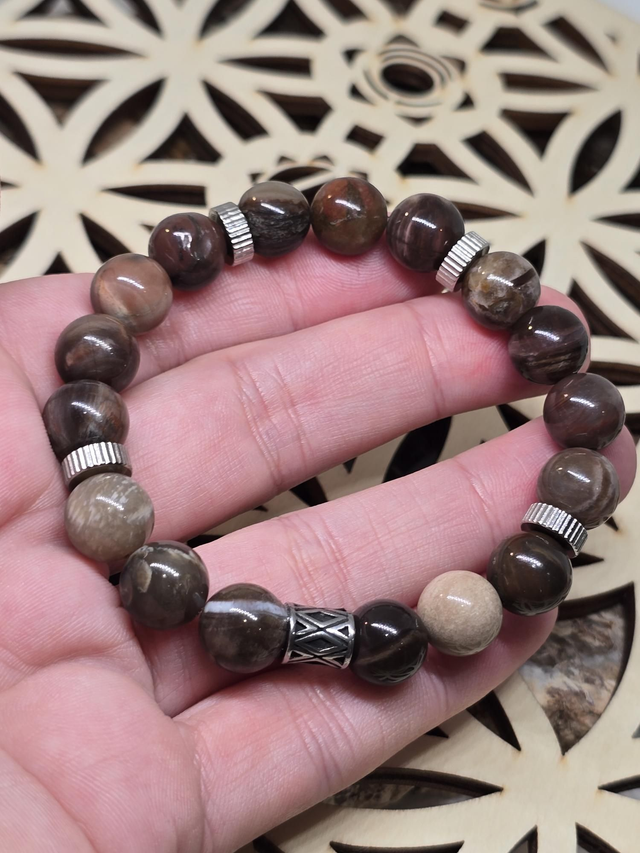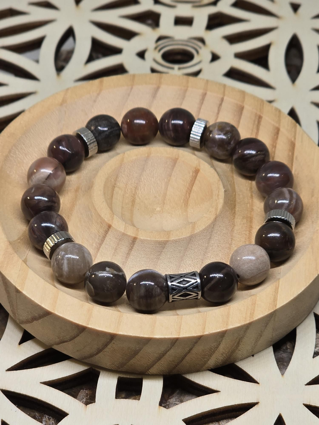 Bracelet homme fait main sur fil élastique solide composé de Bois fossilisé en 1 cm ainsi que de perles en acier inoxydable.