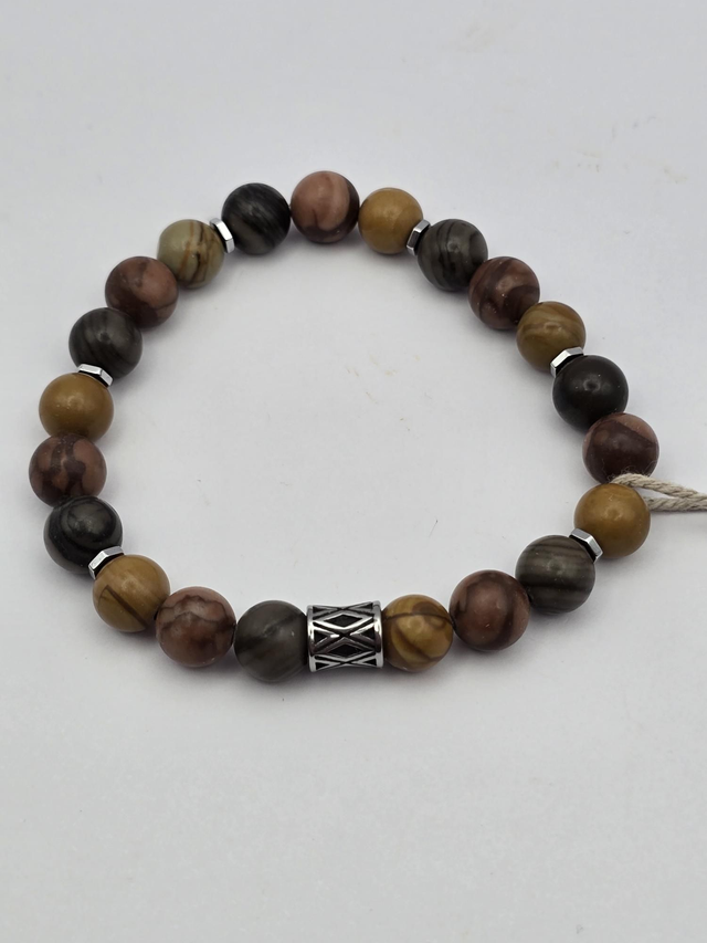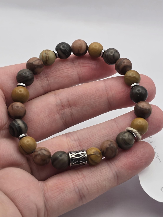 Bracelet fait main sur fil élastique solide composé de Bois fossilisé d'Indonésie en 0,8 cm et perles en hématite plaquée et acier inoxydable.