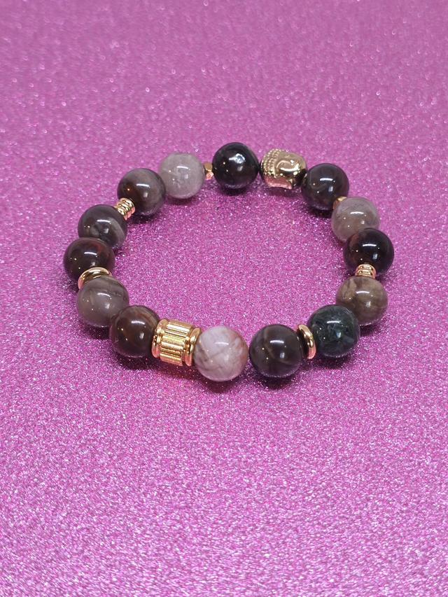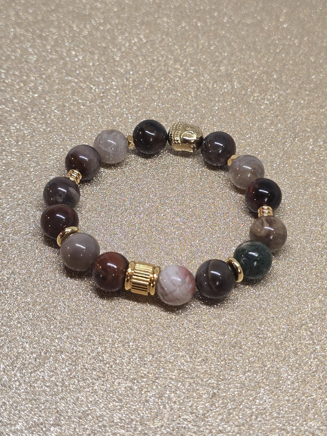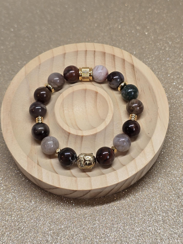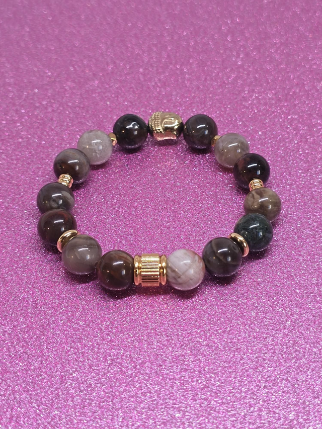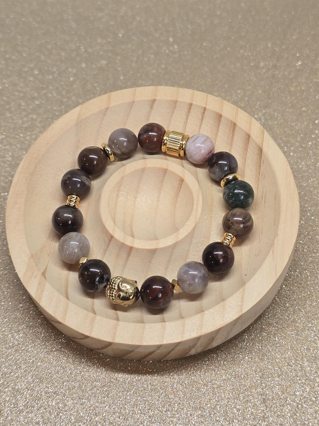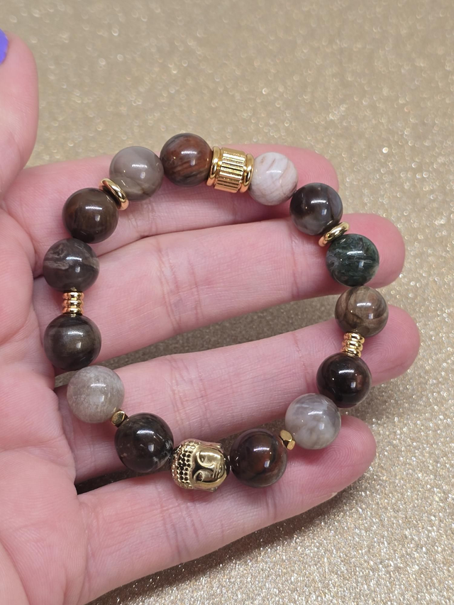 ✨ Bracelet fait main sur fil élastique solide composé de Bois fossilisé en 1 cm ainsi que de perles plaquées et acier inoxydable doré.