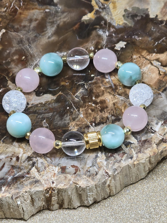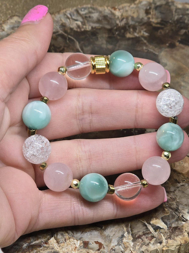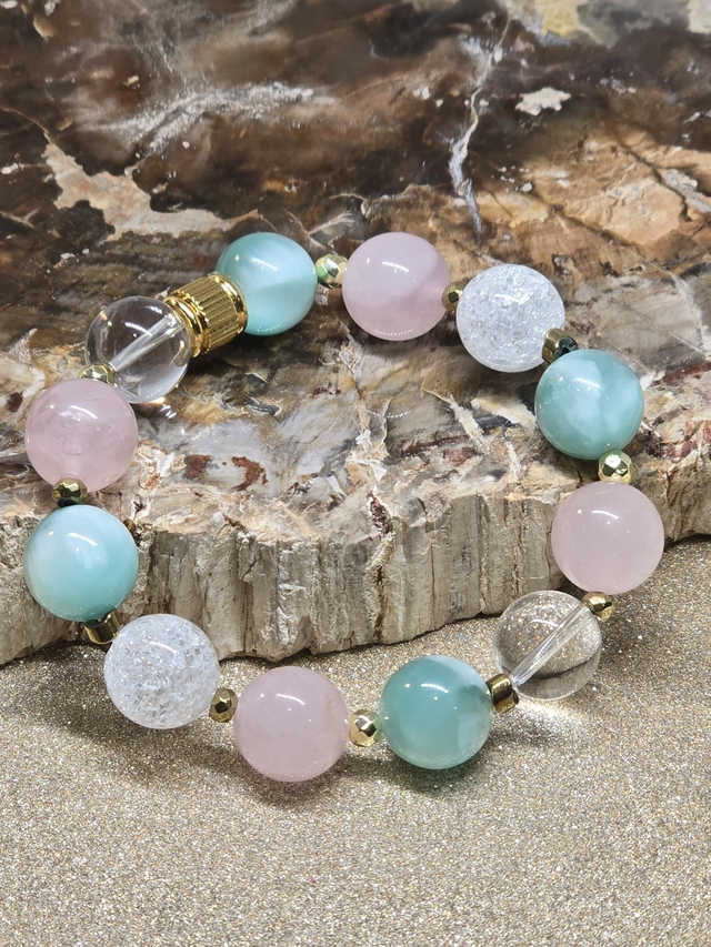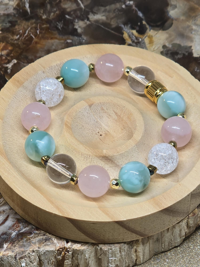 Bracelet fait main sur fil élastique solide composé de Garniérite, Cristal de roche et Quartz rose XL en 1,2 cm ainsi que de perles en hématite plaquée et acier.