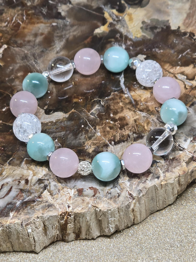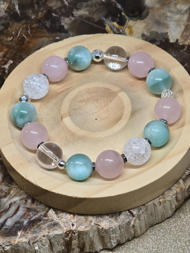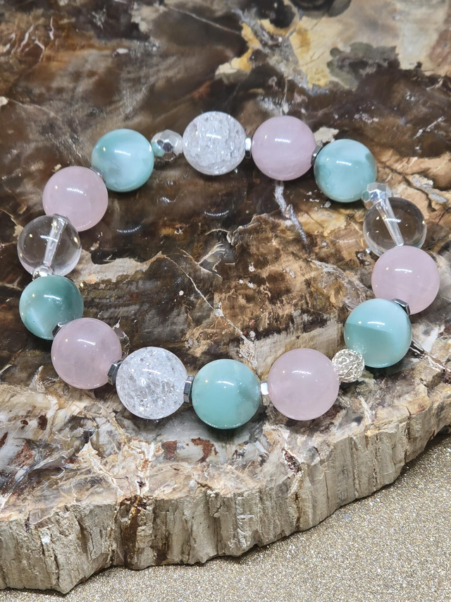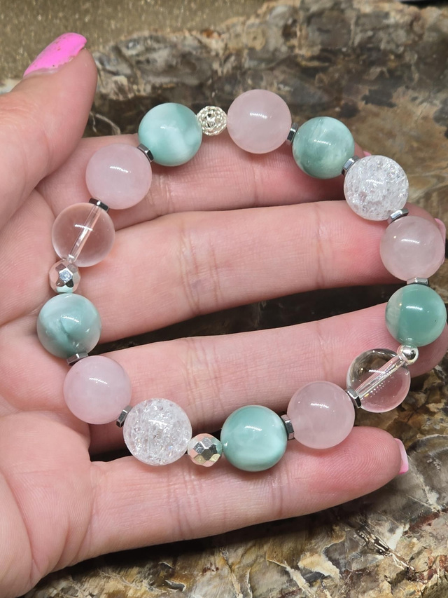 Bracelet fait main sur fil élastique solide composé de Garniérite, Cristal de roche et Quartz rose XL en 1,2 cm ainsi que de perles en hématite et argent plaqué.