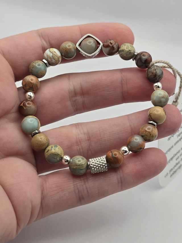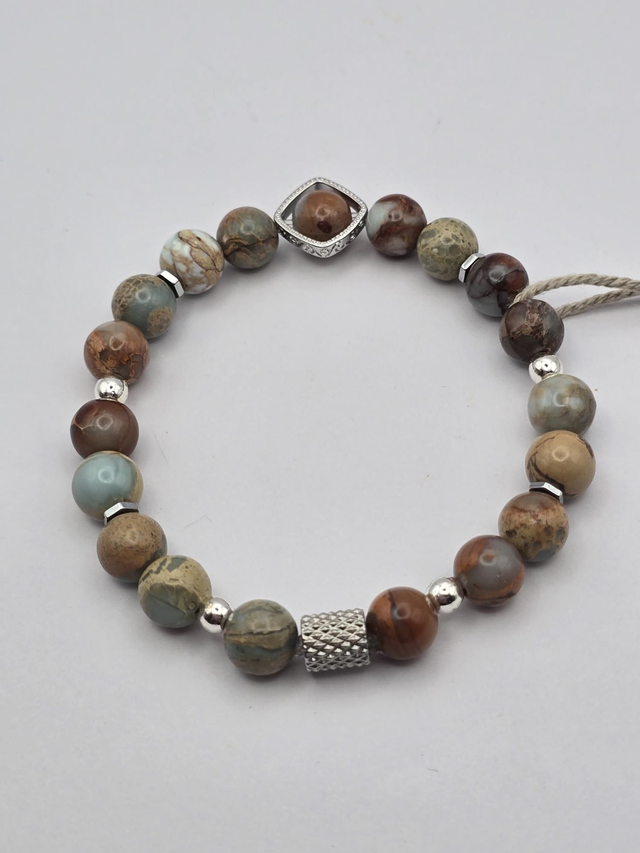 Bracelet fait main sur fil élastique solide composé de Jaspe impérial en 0,8 cm ainsi que de perles en hématite plaquée et acier inoxydable.