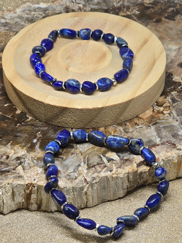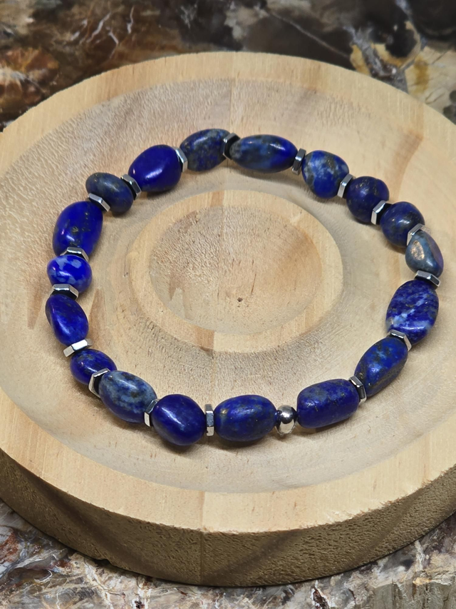 Bracelet fait main sur fil élastique solide composé de mini pierres roulées de Lapis lazuli ainsi que de perles en hématite plaquée.