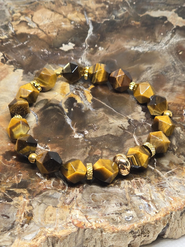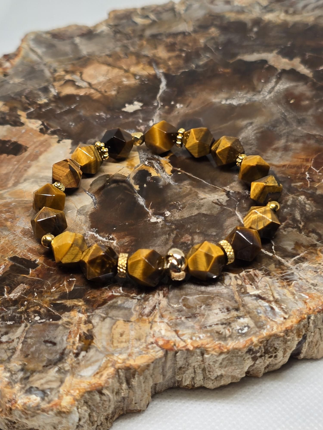 Bracelet fait main sur fil élastique solide composé d'œil de Tigre multifaces ainsi que de perles en hématite plaquée et acier inoxydable.