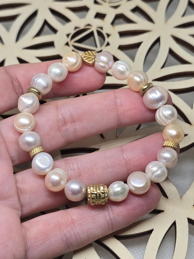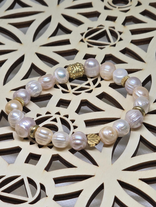 Perle d'eau douce de culture : souvent associées à la pureté, la sagesse et la noblesse. Offrir des perles peut signifier amour, admiration et respect. Les vertus diffèrent selon leur couleur : Si la perle est recouverte d'une nacre blanche, elle est associée à la pureté, la spiritualité, au calme, et l'introspection. Si la nacre possède des nuances de beige et de crème, on lui associe la douceur, à l'apaisement des angoisses et du stress.