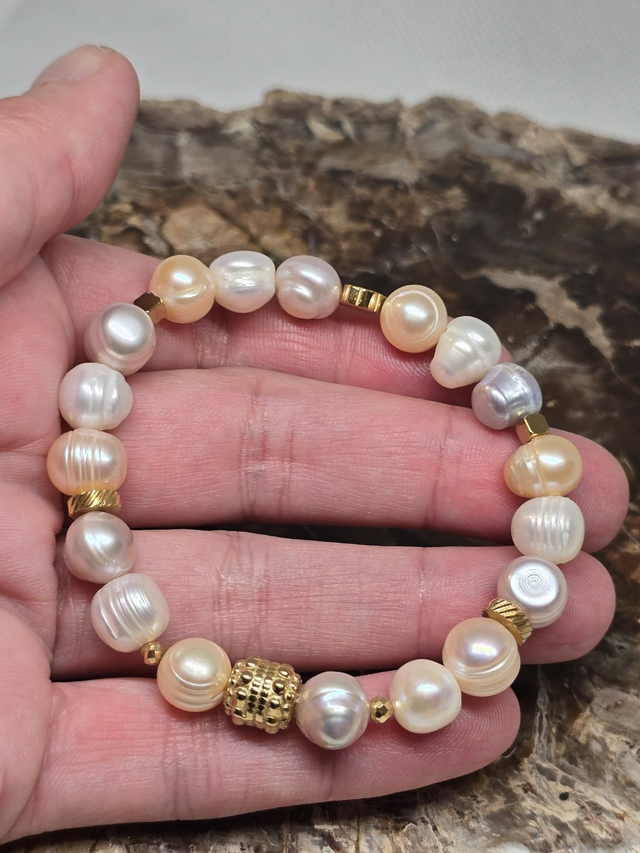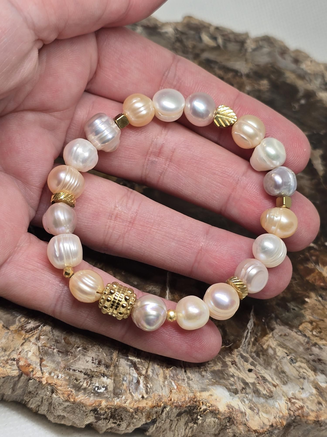 Bracelet fait main sur fil élastique solide composé de Perles de culture d'eau douce multicolore en 1 cm à ainsi que de perles en hématite plaquée et acier inoxydable.