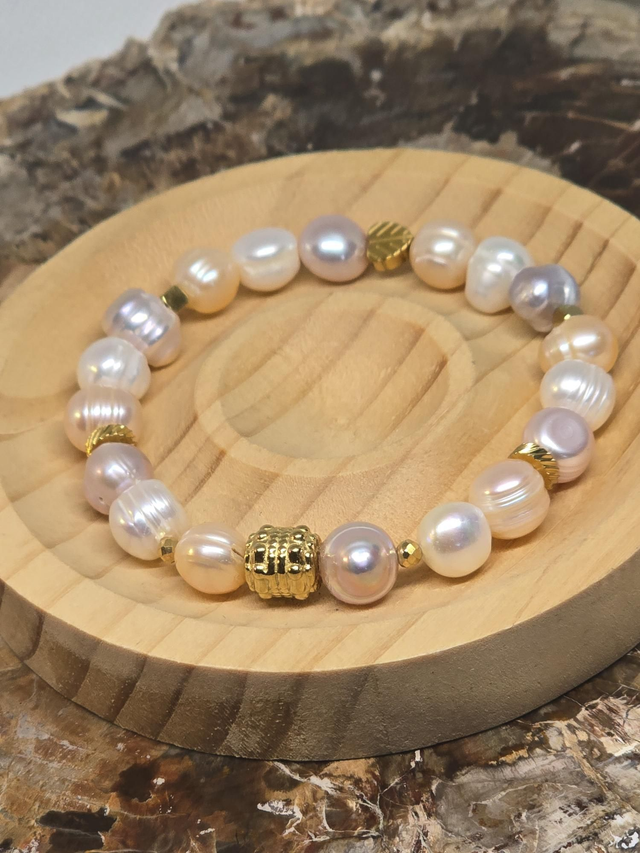 Perle d'eau douce de culture : souvent associées à la pureté, la sagesse et la noblesse. Offrir des perles peut signifier amour, admiration et respect. Les vertus diffèrent selon leur couleur : Si la perle est recouverte d'une nacre blanche, elle est associée à la pureté, la spiritualité, au calme, et l'introspection. Si la nacre possède des nuances de beige et de crème, on lui associe la douceur, à l'apaisement des angoisses et du stress.