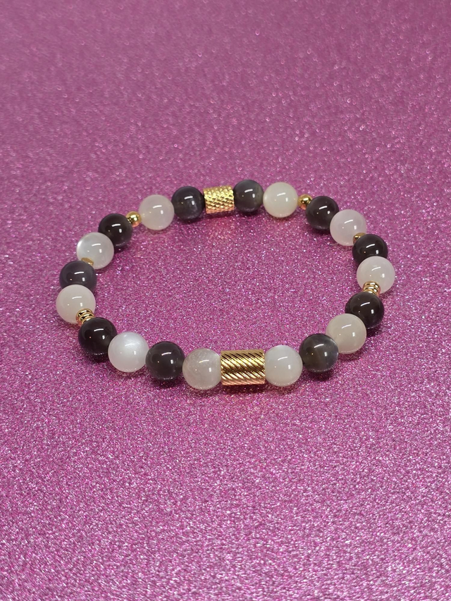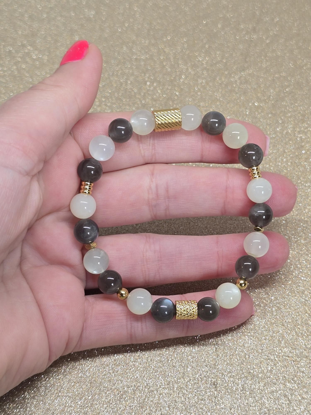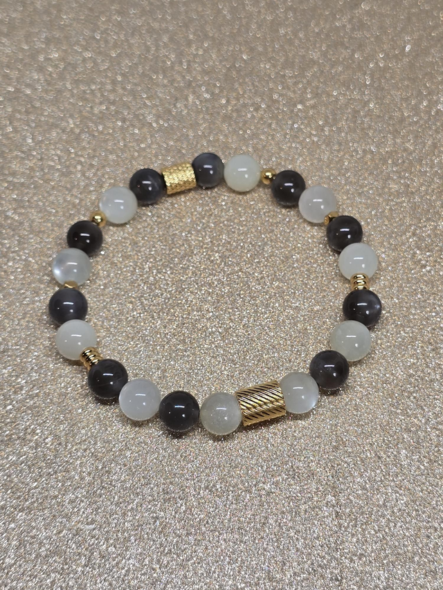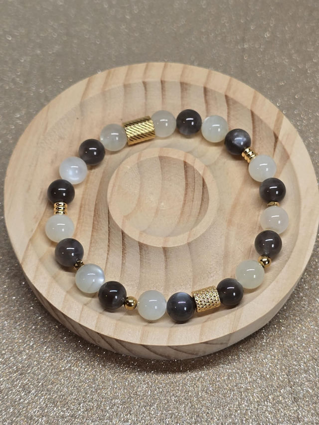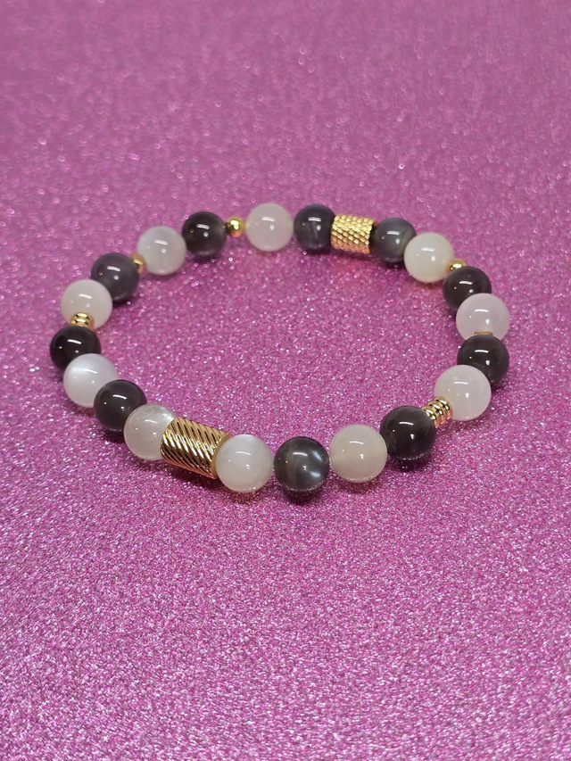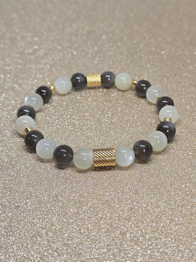 ✨ Bracelet fait main sur fil élastique solide composé de Pierre de lune blanche et noire qualité extra en 0,8 cm ainsi que de perles plaquées et acier inoxydable doré.