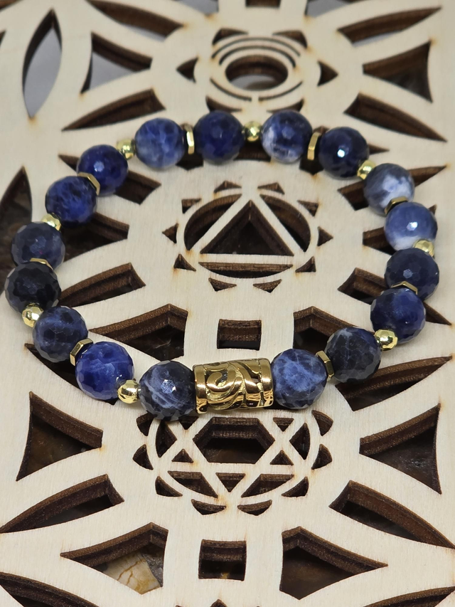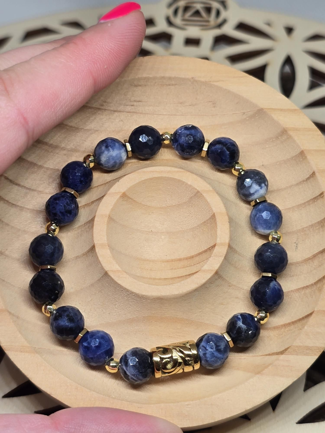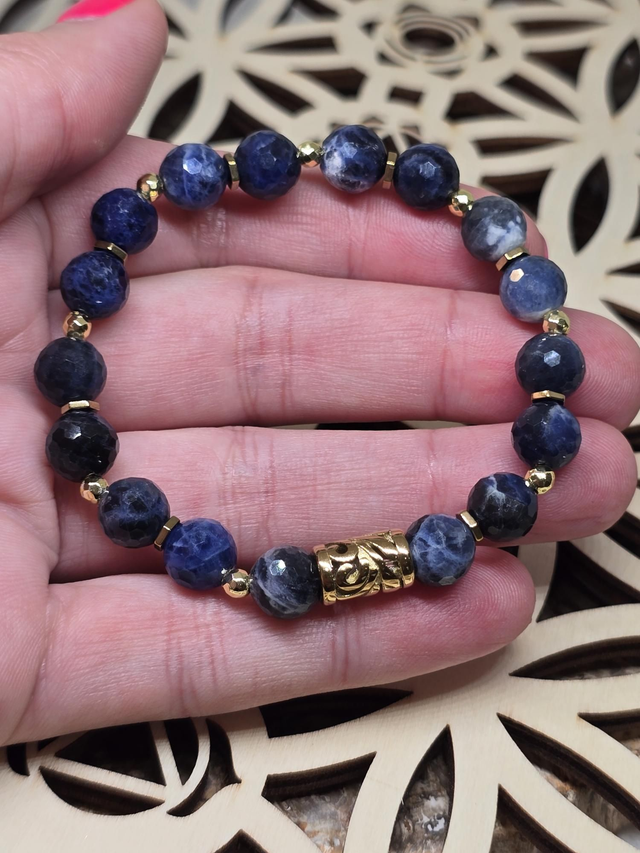Bracelet fait main sur fil élastique solide composé de Sodalite à facettes en 0,8 cm ainsi que de perles en hématite plaquée et acier inoxydable.