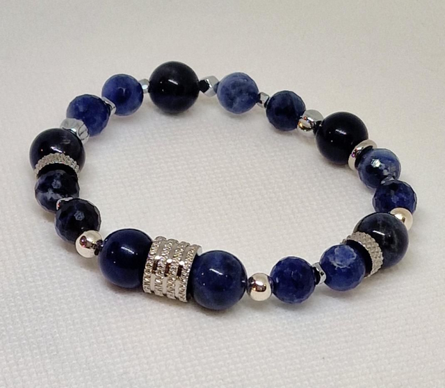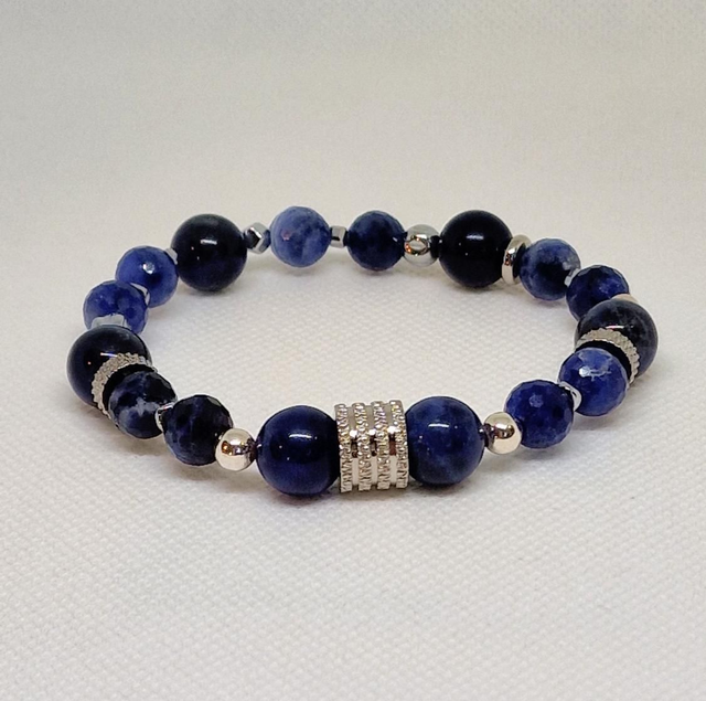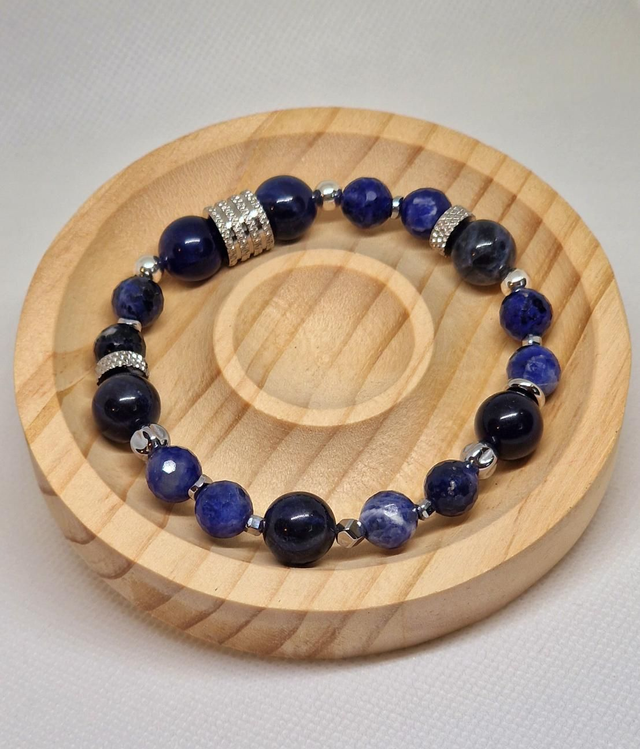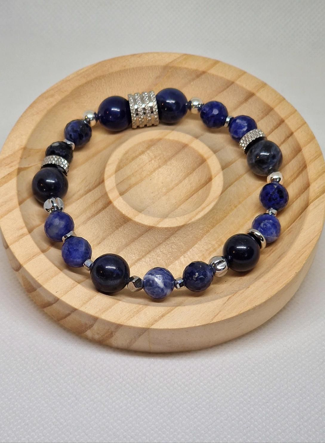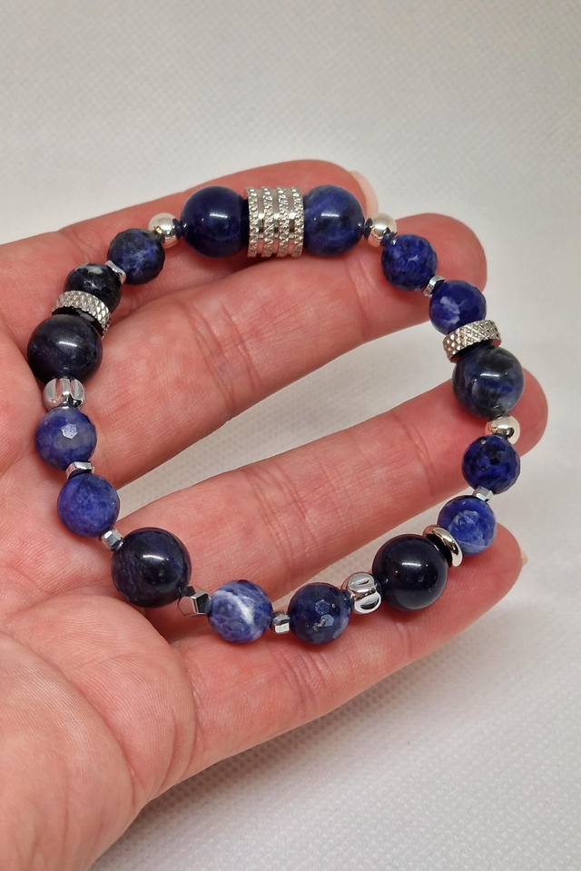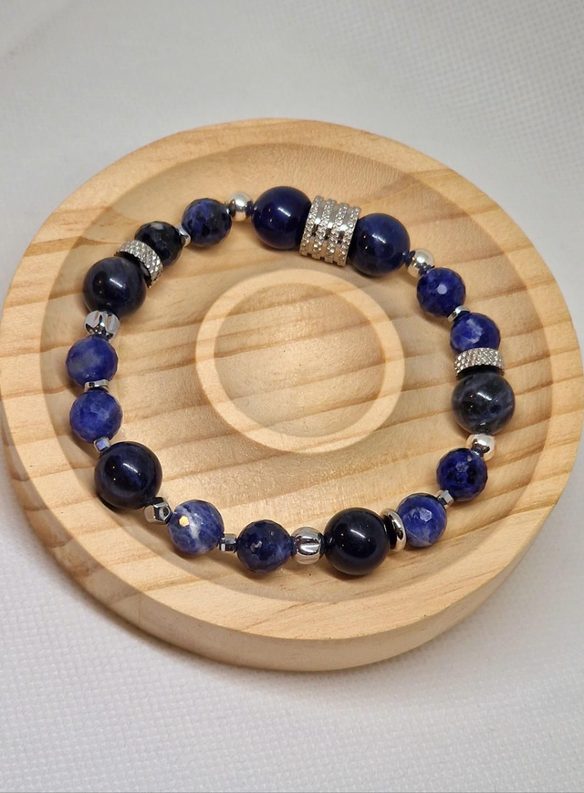 ✨Bracelet fait main sur fil élastique solide, composé de Sodalite en 1cm et Sodalite à facettes en 0,8cm ainsi que de perles en plaqué argent et en acier inoxydable.